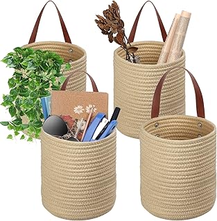 TomCare ハンギングバスケット 4個パック 7.87インチ x 7インチ 小さな織物収納バスケット ジュート織り レザーハンドル付き 小さな装飾バスケットオーガナイザー 植物 キッチン オフィス 寝室用