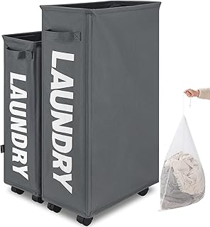 WOWLIVE 2パック トールスリム ランドリーバスケット 拡張ハンドル付き 薄型 折りたたみ式 ダブル L ランドリーバスケット 洗濯物入れ 洗濯物整理 グレー
